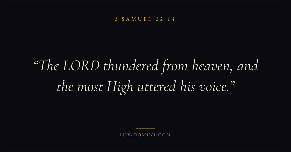 Books / 2 Samuel / Chapter 22 / Verse 14 ← 2 Samuel 22:13 2 Samuel 22:14 2 Samuel 22:15 → The LORD thundered from heaven, and the most High uttered his voice. Download verse card Share on Twitter Share on Facebook Pin it ✦ Key themes Justice and mercyDavidic covenantSin and judgmentMercy Read with 2 Samuel 22:132 Samuel 22:15Micah 6:8Amos 5:24 Related topics Bible verses about justice and mercy ✦ 2 Samuel Chapter 22 verses V. 1 V. 2 V. 3 V. 4 V. 5 V. 6 V. 7 V. 8 V. 9 V. 10 V. 11 V. 12 V. 13 V. 14 V. 15 V. 16 V. 17 V. 18 V. 19 V. 20 V. 21 V. 22 V. 23 V. 24 V. 25 V. 26 V. 27 V. 28 V. 29 V. 30 V. 31 V. 32 V. 33 V. 34 V. 35 V. 36 V. 37 V. 38 V. 39 V. 40 V. 41 V. 42 V. 43 V. 44 V. 45 V. 46 V. 47 V. 48 V. 49 V. 50 V. 51
