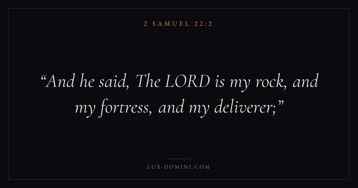 Books / 2 Samuel / Chapter 22 / Verse 2 ← 2 Samuel 22:1 2 Samuel 22:2 2 Samuel 22:3 → And he said, The LORD is my rock, and my fortress, and my deliverer; Download verse card Share on Twitter Share on Facebook Pin it ✦ Key themes Justice and mercyDavidic covenantSin and judgmentMercy Read with 2 Samuel 22:32 Samuel 22:4Micah 6:8Amos 5:24 Related topics Bible verses about justice and mercy ✦ 2 Samuel Chapter 22 verses V. 1 V. 2 V. 3 V. 4 V. 5 V. 6 V. 7 V. 8 V. 9 V. 10 V. 11 V. 12 V. 13 V. 14 V. 15 V. 16 V. 17 V. 18 V. 19 V. 20 V. 21 V. 22 V. 23 V. 24 V. 25 V. 26 V. 27 V. 28 V. 29 V. 30 V. 31 V. 32 V. 33 V. 34 V. 35 V. 36 V. 37 V. 38 V. 39 V. 40 V. 41 V. 42 V. 43 V. 44 V. 45 V. 46 V. 47 V. 48 V. 49 V. 50 V. 51