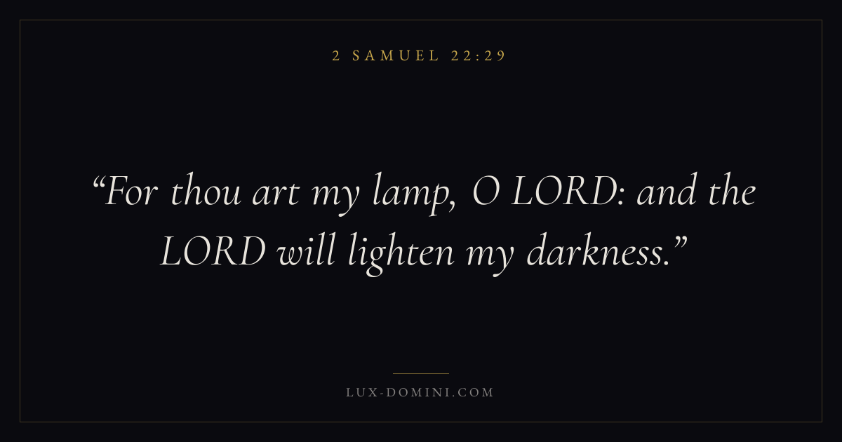 Books / 2 Samuel / Chapter 22 / Verse 29 ← 2 Samuel 22:28 2 Samuel 22:29 2 Samuel 22:30 → For thou art my lamp, O LORD: and the LORD will lighten my darkness. Download verse card Share on Twitter Share on Facebook Pin it ✦ Key themes Justice and mercyDavidic covenantSin and judgmentMercy Read with 2 Samuel 22:272 Samuel 22:28Micah 6:8Amos 5:24 Related topics Bible verses about justice and mercy ✦ 2 Samuel Chapter 22 verses V. 1 V. 2 V. 3 V. 4 V. 5 V. 6 V. 7 V. 8 V. 9 V. 10 V. 11 V. 12 V. 13 V. 14 V. 15 V. 16 V. 17 V. 18 V. 19 V. 20 V. 21 V. 22 V. 23 V. 24 V. 25 V. 26 V. 27 V. 28 V. 29 V. 30 V. 31 V. 32 V. 33 V. 34 V. 35 V. 36 V. 37 V. 38 V. 39 V. 40 V. 41 V. 42 V. 43 V. 44 V. 45 V. 46 V. 47 V. 48 V. 49 V. 50 V. 51