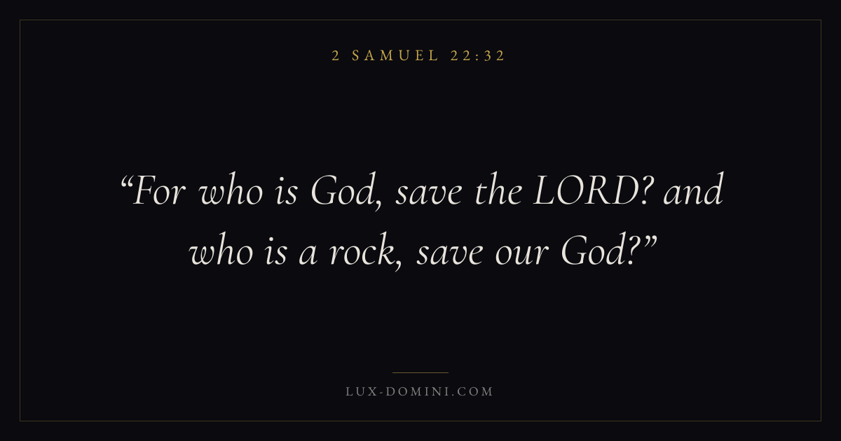 Books / 2 Samuel / Chapter 22 / Verse 32 ← 2 Samuel 22:31 2 Samuel 22:32 2 Samuel 22:33 → For who is God, save the LORD? and who is a rock, save our God? Download verse card Share on Twitter Share on Facebook Pin it ✦ Key themes Justice and mercySalvationDavidic covenantSin and judgment Read with 2 Samuel 22:31Micah 6:8Amos 5:24John 3:16 Related topics Bible verses about justice and mercyBible verses about salvation ✦ 2 Samuel Chapter 22 verses V. 1 V. 2 V. 3 V. 4 V. 5 V. 6 V. 7 V. 8 V. 9 V. 10 V. 11 V. 12 V. 13 V. 14 V. 15 V. 16 V. 17 V. 18 V. 19 V. 20 V. 21 V. 22 V. 23 V. 24 V. 25 V. 26 V. 27 V. 28 V. 29 V. 30 V. 31 V. 32 V. 33 V. 34 V. 35 V. 36 V. 37 V. 38 V. 39 V. 40 V. 41 V. 42 V. 43 V. 44 V. 45 V. 46 V. 47 V. 48 V. 49 V. 50 V. 51