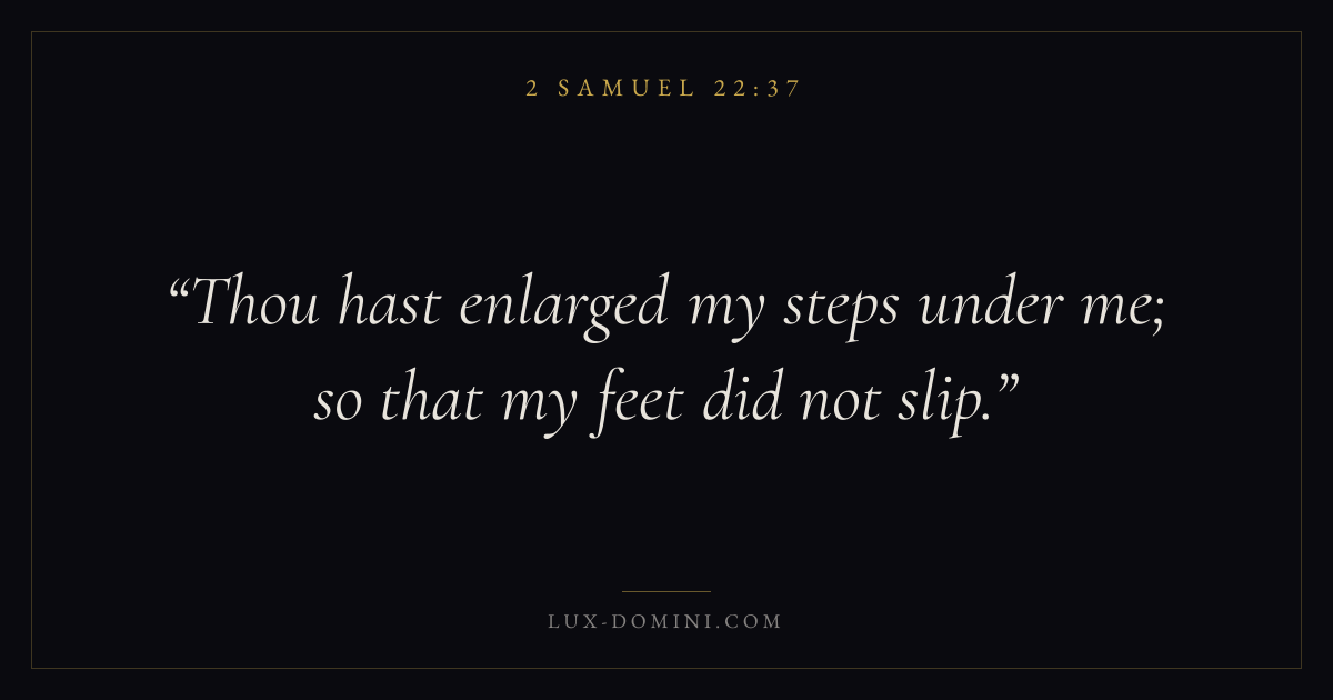 Books / 2 Samuel / Chapter 22 / Verse 37 ← 2 Samuel 22:36 2 Samuel 22:37 2 Samuel 22:38 → Thou hast enlarged my steps under me; so that my feet did not slip. Download verse card Share on Twitter Share on Facebook Pin it ✦ Key themes Justice and mercyDavidic covenantSin and judgmentMercy Read with 2 Samuel 22:352 Samuel 22:36Micah 6:8Amos 5:24 Related topics Bible verses about justice and mercy ✦ 2 Samuel Chapter 22 verses V. 1 V. 2 V. 3 V. 4 V. 5 V. 6 V. 7 V. 8 V. 9 V. 10 V. 11 V. 12 V. 13 V. 14 V. 15 V. 16 V. 17 V. 18 V. 19 V. 20 V. 21 V. 22 V. 23 V. 24 V. 25 V. 26 V. 27 V. 28 V. 29 V. 30 V. 31 V. 32 V. 33 V. 34 V. 35 V. 36 V. 37 V. 38 V. 39 V. 40 V. 41 V. 42 V. 43 V. 44 V. 45 V. 46 V. 47 V. 48 V. 49 V. 50 V. 51