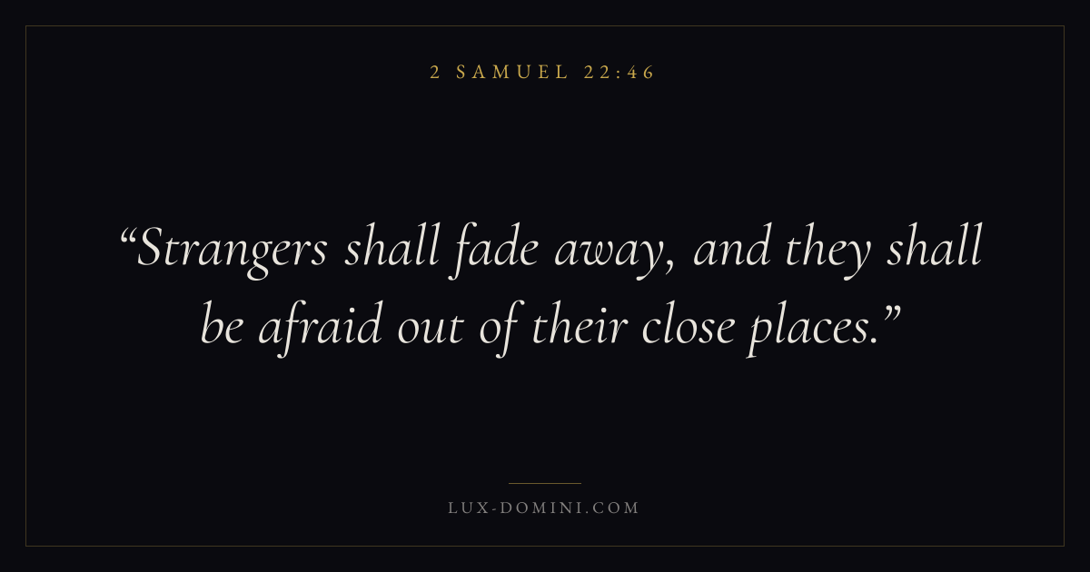 Books / 2 Samuel / Chapter 22 / Verse 46 ← 2 Samuel 22:45 2 Samuel 22:46 2 Samuel 22:47 → Strangers shall fade away, and they shall be afraid out of their close places. Download verse card Share on Twitter Share on Facebook Pin it ✦ Key themes Anxiety and fearJustice and mercyDavidic covenantSin and judgment Read with 2 Samuel 22:47Philippians 4:6Isaiah 41:10Micah 6:8 Related topics Bible verses about anxiety and fearBible verses about justice and mercy ✦ 2 Samuel Chapter 22 verses V. 1 V. 2 V. 3 V. 4 V. 5 V. 6 V. 7 V. 8 V. 9 V. 10 V. 11 V. 12 V. 13 V. 14 V. 15 V. 16 V. 17 V. 18 V. 19 V. 20 V. 21 V. 22 V. 23 V. 24 V. 25 V. 26 V. 27 V. 28 V. 29 V. 30 V. 31 V. 32 V. 33 V. 34 V. 35 V. 36 V. 37 V. 38 V. 39 V. 40 V. 41 V. 42 V. 43 V. 44 V. 45 V. 46 V. 47 V. 48 V. 49 V. 50 V. 51