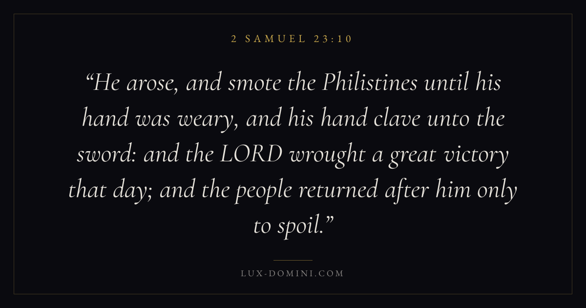 He arose, and smote the Philistines until his hand was weary, and his hand clave unto the sword: and the LORD wrought a great victory that day; and the people returned after him only to spoil.