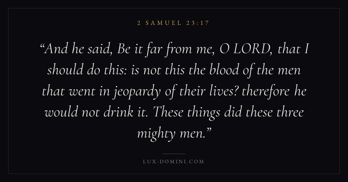 And he said, Be it far from me, O LORD, that I should do this: is not this the blood of the men that went in jeopardy of their lives? therefore he would not drink it. These things did these three mighty men.