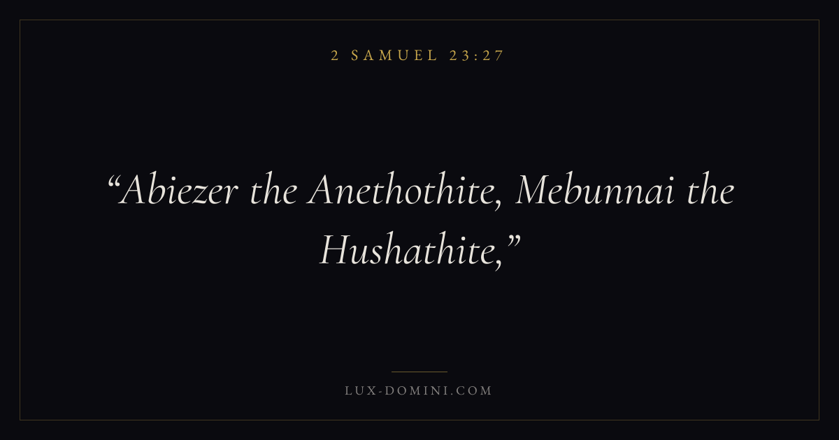 Books / 2 Samuel / Chapter 23 / Verse 27 ← 2 Samuel 23:26 2 Samuel 23:27 2 Samuel 23:28 → Abiezer the Anethothite, Mebunnai the Hushathite, Download verse card Share on Twitter Share on Facebook Pin it ✦ Key themes Justice and mercyDavidic covenantSin and judgmentMercy Read with 2 Samuel 23:242 Samuel 23:25Micah 6:8Amos 5:24 Related topics Bible verses about justice and mercy Glossary Anathoth Place Biblical settlement. Modern identification: Ras el Kharruba. Hushah Place Biblical settlement. Modern identification: Husan. ✦ 2 Samuel Chapter 23 verses V. 1 V. 2 V. 3 V. 4 V. 5 V. 6 V. 7 V. 8 V. 9 V. 10 V. 11 V. 12 V. 13 V. 14 V. 15 V. 16 V. 17 V. 18 V. 19 V. 20 V. 21 V. 22 V. 23 V. 24 V. 25 V. 26 V. 27 V. 28 V. 29 V. 30 V. 31 V. 32 V. 33 V. 34 V. 35 V. 36 V. 37 V. 38 V. 39