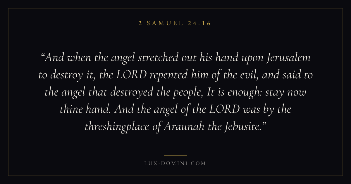 And when the angel stretched out his hand upon Jerusalem to destroy it, the LORD repented him of the evil, and said to the angel that destroyed the people, It is enough: stay now thine hand. And the angel of the LORD was by the threshingplace of Araunah the Jebusite.