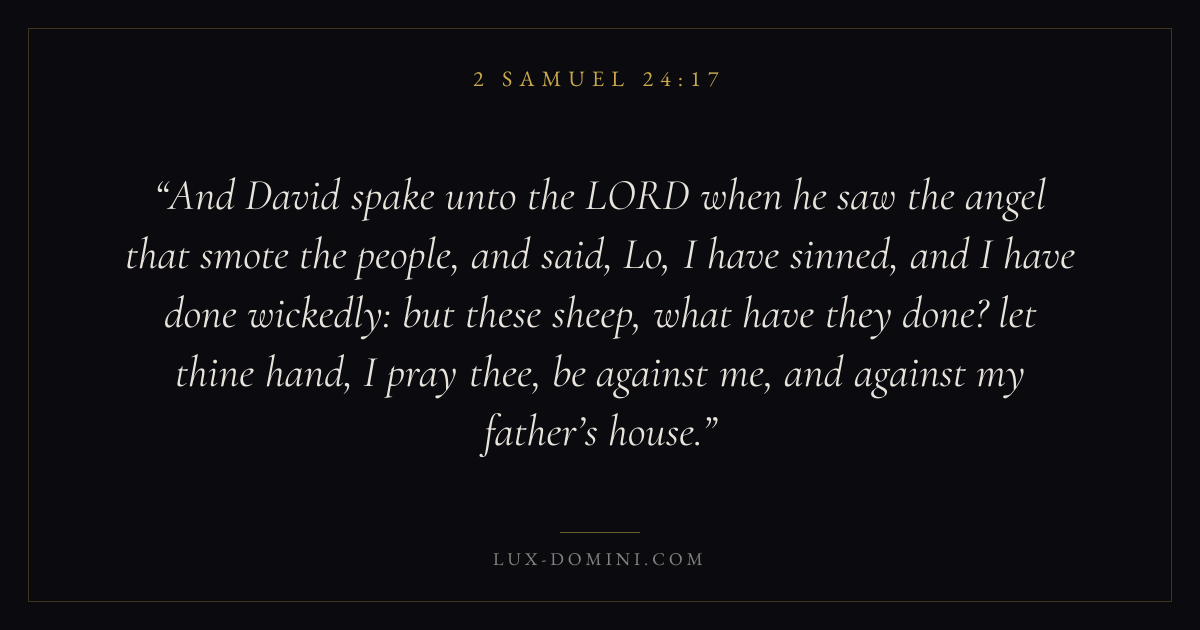 And David spake unto the LORD when he saw the angel that smote the people, and said, Lo, I have sinned, and I have done wickedly: but these sheep, what have they done? let thine hand, I pray thee, be against me, and against my father’s house.
