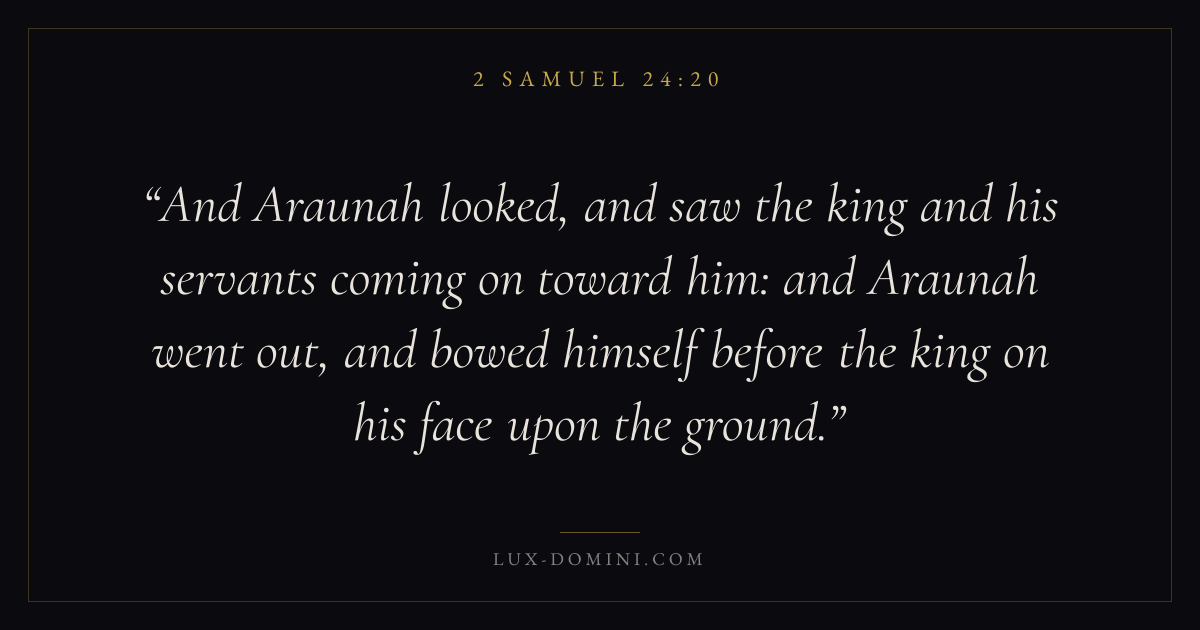 And Araunah looked, and saw the king and his servants coming on toward him: and Araunah went out, and bowed himself before the king on his face upon the ground.