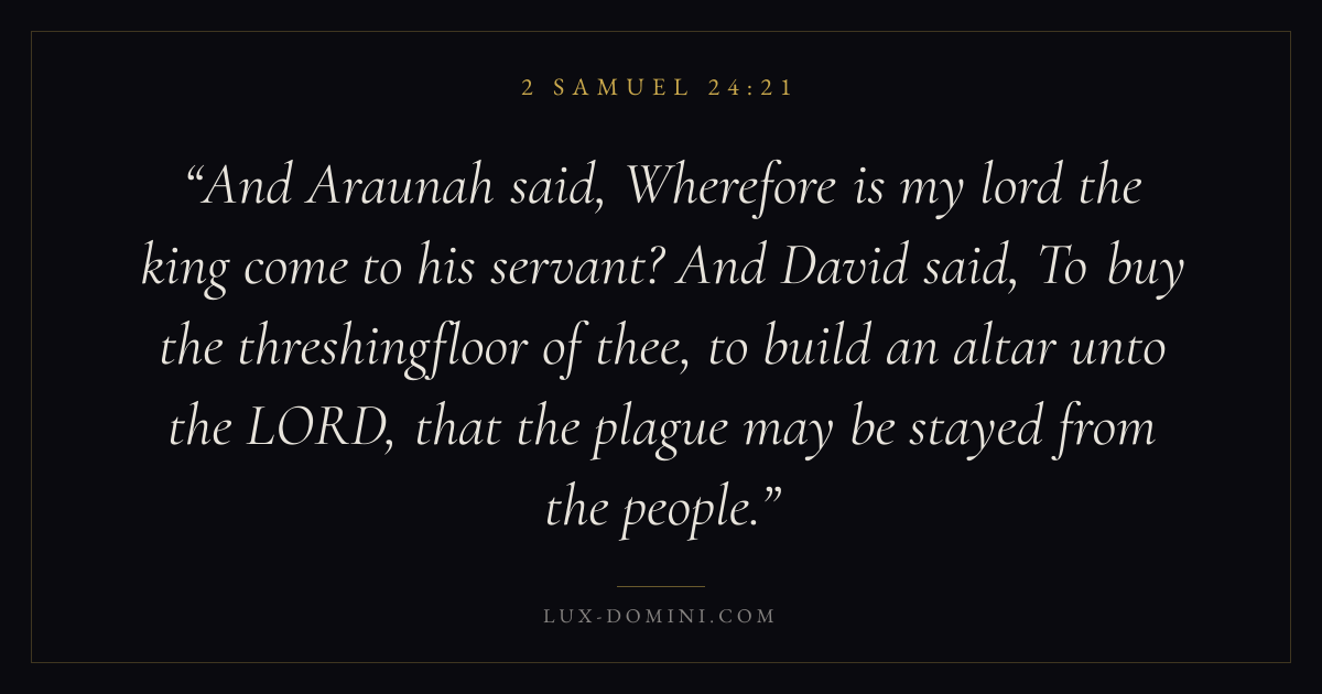 And Araunah said, Wherefore is my lord the king come to his servant? And David said, To buy the threshingfloor of thee, to build an altar unto the LORD, that the plague may be stayed from the people.