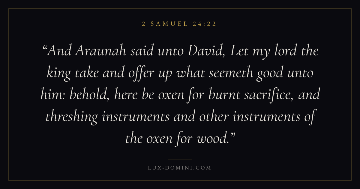And Araunah said unto David, Let my lord the king take and offer up what seemeth good unto him: behold, here be oxen for burnt sacrifice, and threshing instruments and other instruments of the oxen for wood.
