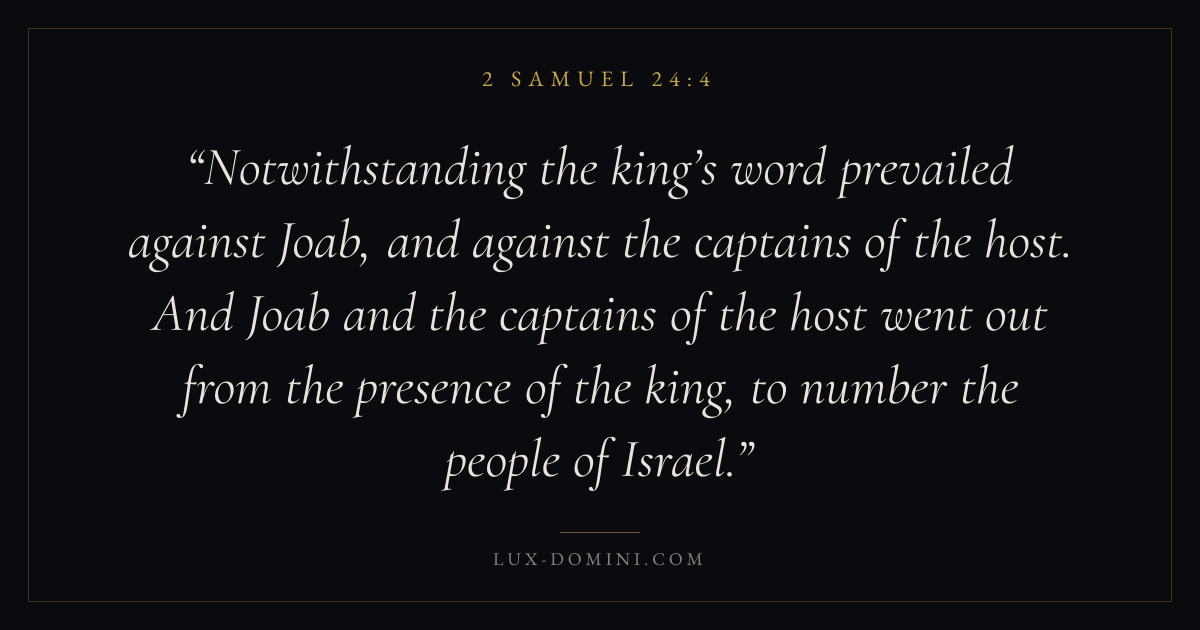Notwithstanding the king’s word prevailed against Joab, and against the captains of the host. And Joab and the captains of the host went out from the presence of the king, to number the people of Israel.