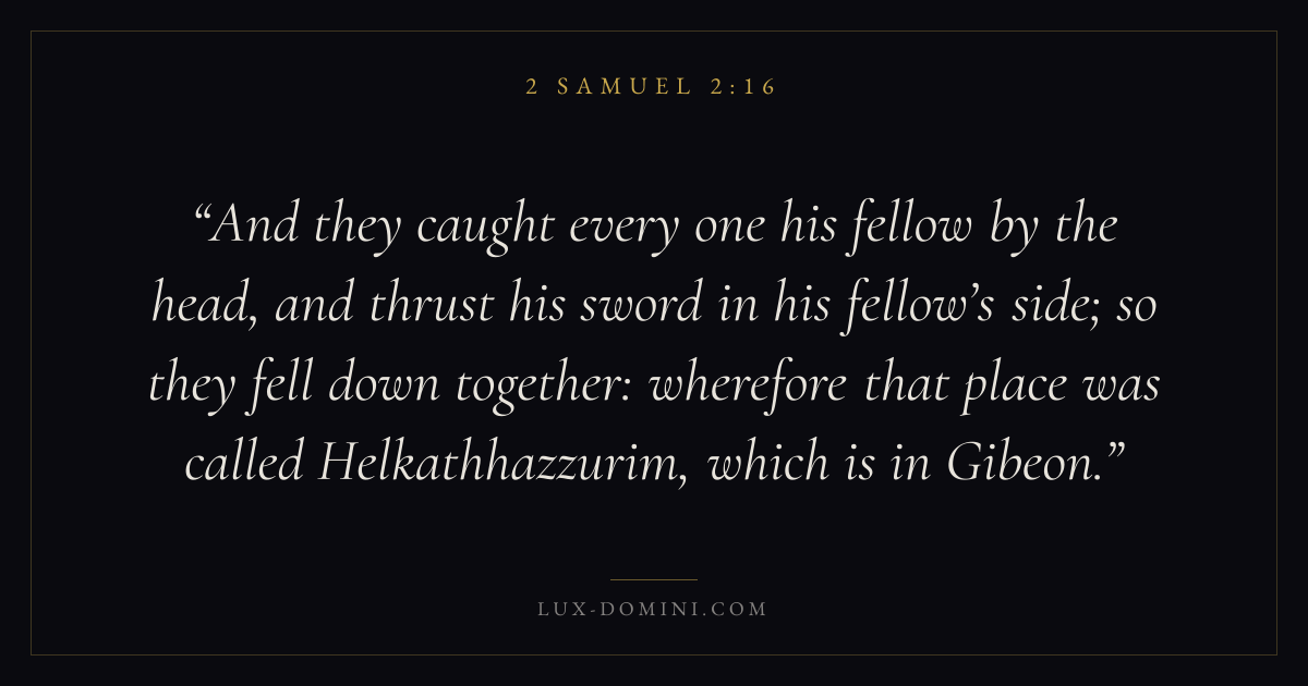And they caught every one his fellow by the head, and thrust his sword in his fellow’s side; so they fell down together: wherefore that place was called Helkathhazzurim, which is in Gibeon.