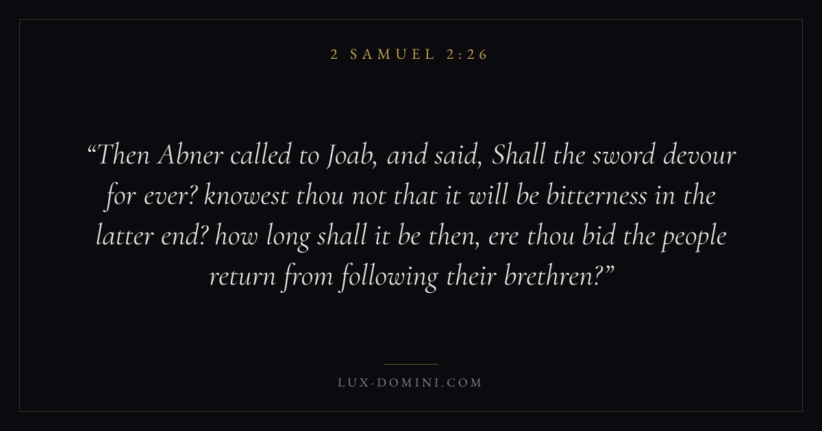 Then Abner called to Joab, and said, Shall the sword devour for ever? knowest thou not that it will be bitterness in the latter end? how long shall it be then, ere thou bid the people return from following their brethren?