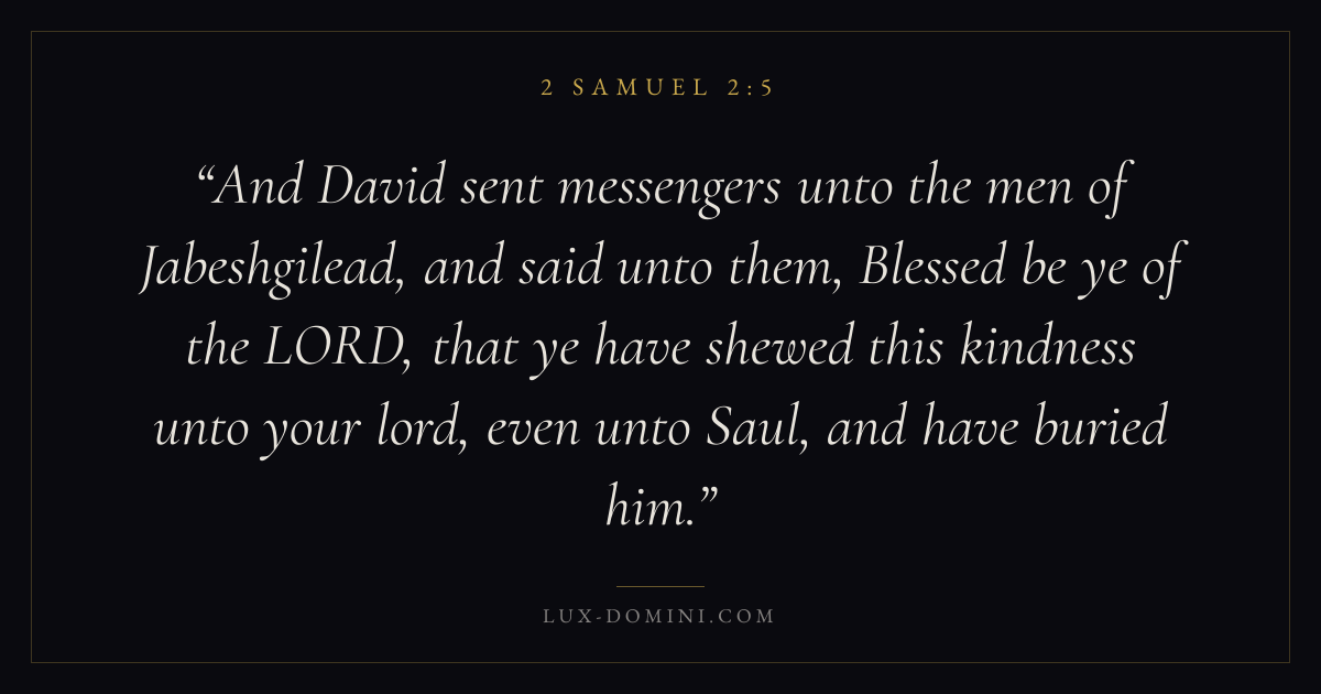 And David sent messengers unto the men of Jabeshgilead, and said unto them, Blessed be ye of the LORD, that ye have shewed this kindness unto your lord, even unto Saul, and have buried him.
