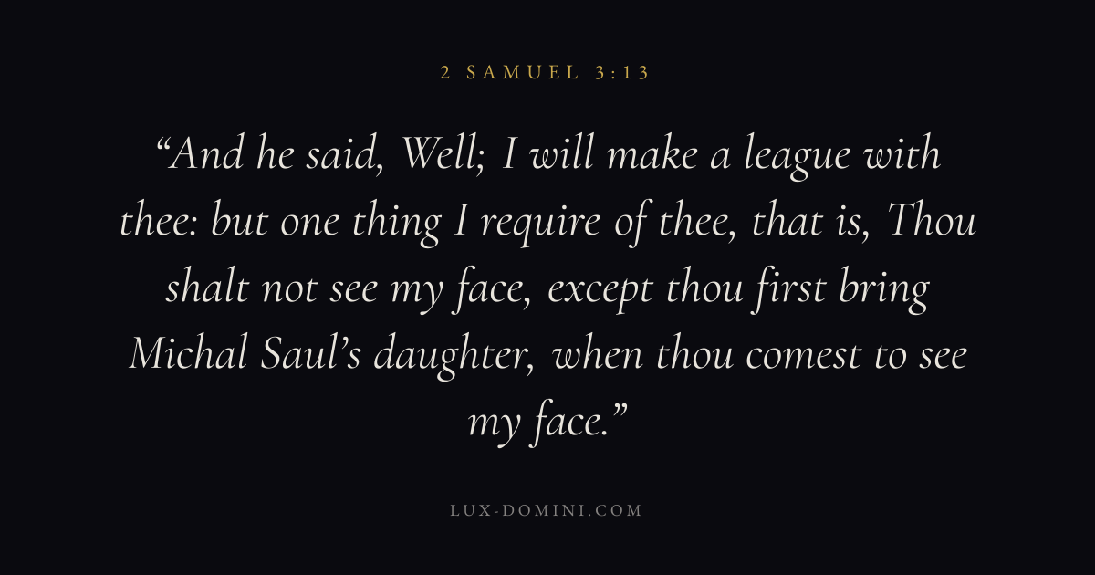 And he said, Well; I will make a league with thee: but one thing I require of thee, that is, Thou shalt not see my face, except thou first bring Michal Saul’s daughter, when thou comest to see my face.