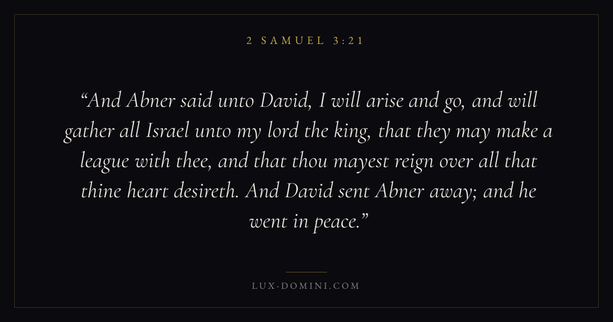 And Abner said unto David, I will arise and go, and will gather all Israel unto my lord the king, that they may make a league with thee, and that thou mayest reign over all that thine heart desireth. And David sent Abner away; and he went in peace.