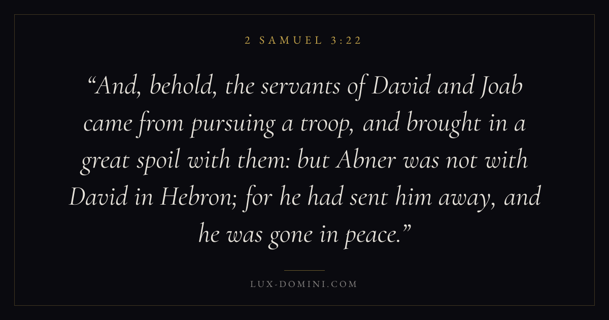 And, behold, the servants of David and Joab came from pursuing a troop, and brought in a great spoil with them: but Abner was not with David in Hebron; for he had sent him away, and he was gone in peace.