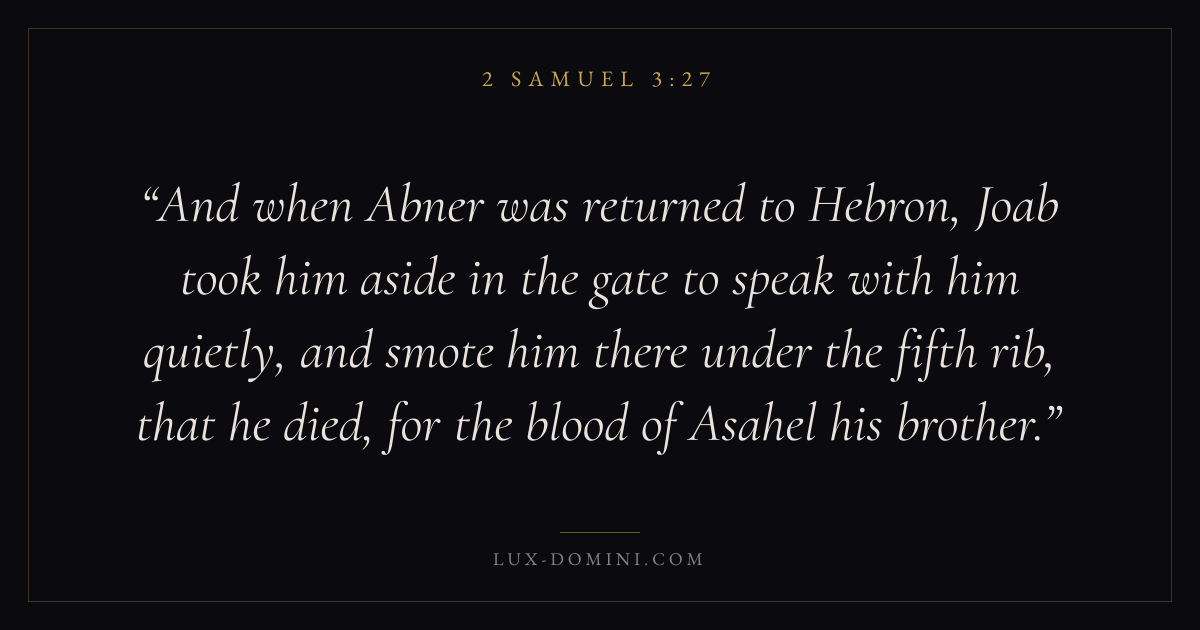 And when Abner was returned to Hebron, Joab took him aside in the gate to speak with him quietly, and smote him there under the fifth rib, that he died, for the blood of Asahel his brother.