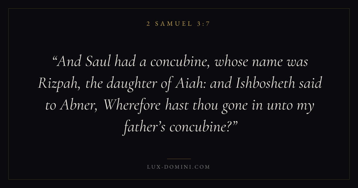 And Saul had a concubine, whose name was Rizpah, the daughter of Aiah: and Ishbosheth said to Abner, Wherefore hast thou gone in unto my father’s concubine?