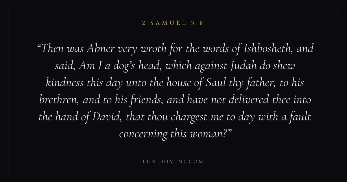 Then was Abner very wroth for the words of Ishbosheth, and said, Am I a dog’s head, which against Judah do shew kindness this day unto the house of Saul thy father, to his brethren, and to his friends, and have not delivered thee into the hand of David, that thou chargest me to day with a fault concerning this woman?