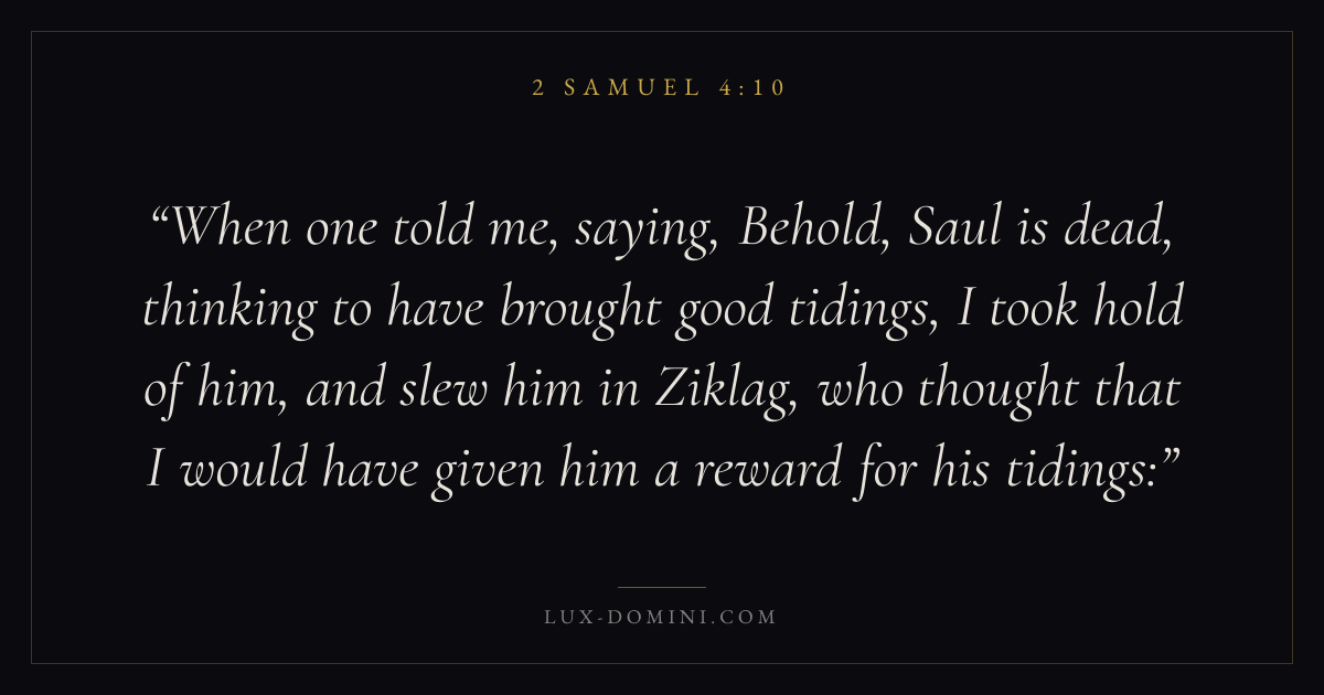 When one told me, saying, Behold, Saul is dead, thinking to have brought good tidings, I took hold of him, and slew him in Ziklag, who thought that I would have given him a reward for his tidings: