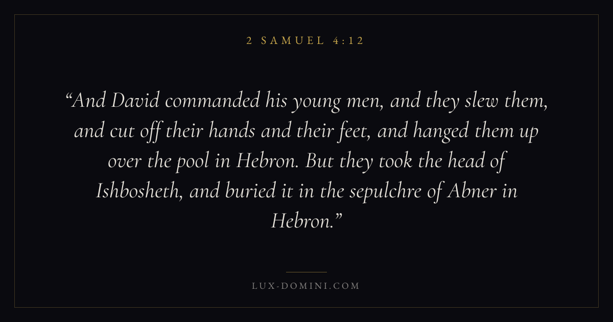 And David commanded his young men, and they slew them, and cut off their hands and their feet, and hanged them up over the pool in Hebron. But they took the head of Ishbosheth, and buried it in the sepulchre of Abner in Hebron.