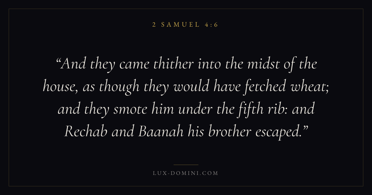 And they came thither into the midst of the house, as though they would have fetched wheat; and they smote him under the fifth rib: and Rechab and Baanah his brother escaped.