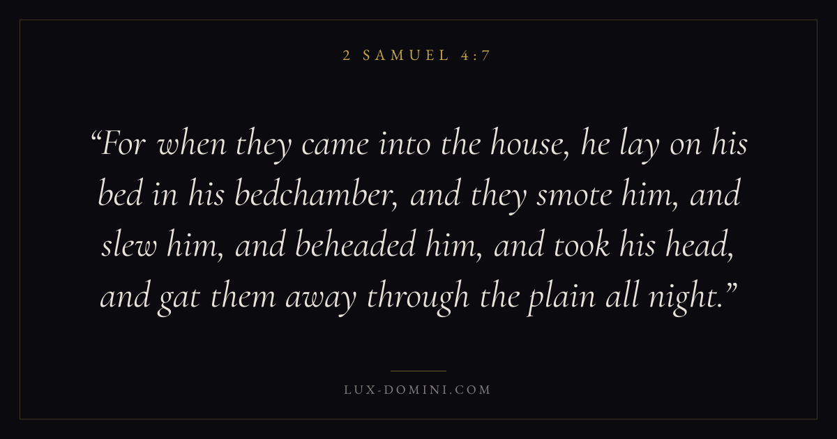 For when they came into the house, he lay on his bed in his bedchamber, and they smote him, and slew him, and beheaded him, and took his head, and gat them away through the plain all night.
