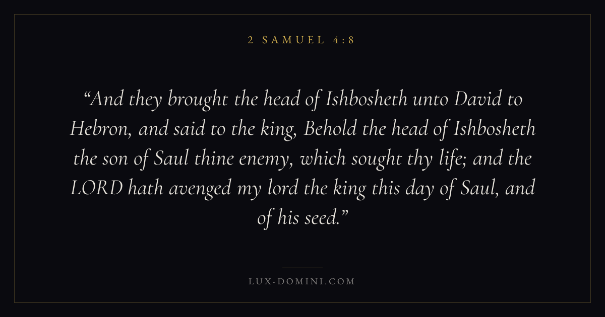 And they brought the head of Ishbosheth unto David to Hebron, and said to the king, Behold the head of Ishbosheth the son of Saul thine enemy, which sought thy life; and the LORD hath avenged my lord the king this day of Saul, and of his seed.