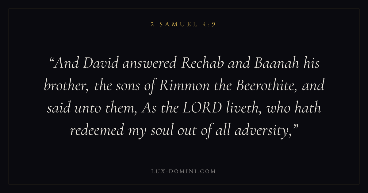 And David answered Rechab and Baanah his brother, the sons of Rimmon the Beerothite, and said unto them, As the LORD liveth, who hath redeemed my soul out of all adversity,