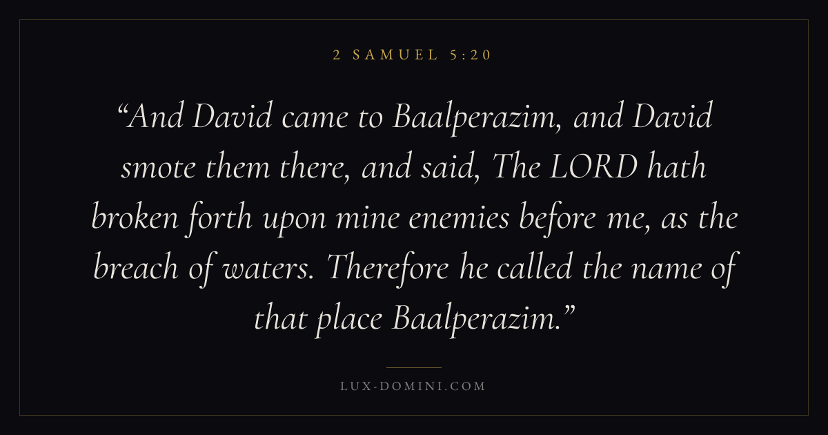 And David came to Baalperazim, and David smote them there, and said, The LORD hath broken forth upon mine enemies before me, as the breach of waters. Therefore he called the name of that place Baalperazim.