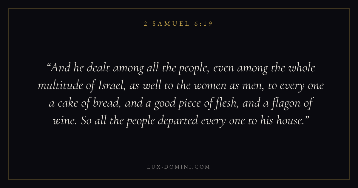 And he dealt among all the people, even among the whole multitude of Israel, as well to the women as men, to every one a cake of bread, and a good piece of flesh, and a flagon of wine. So all the people departed every one to his house.