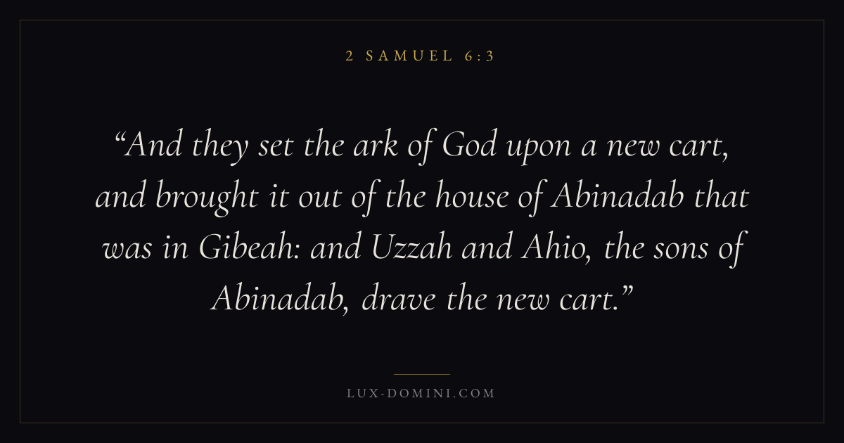 And they set the ark of God upon a new cart, and brought it out of the house of Abinadab that was in Gibeah: and Uzzah and Ahio, the sons of Abinadab, drave the new cart.