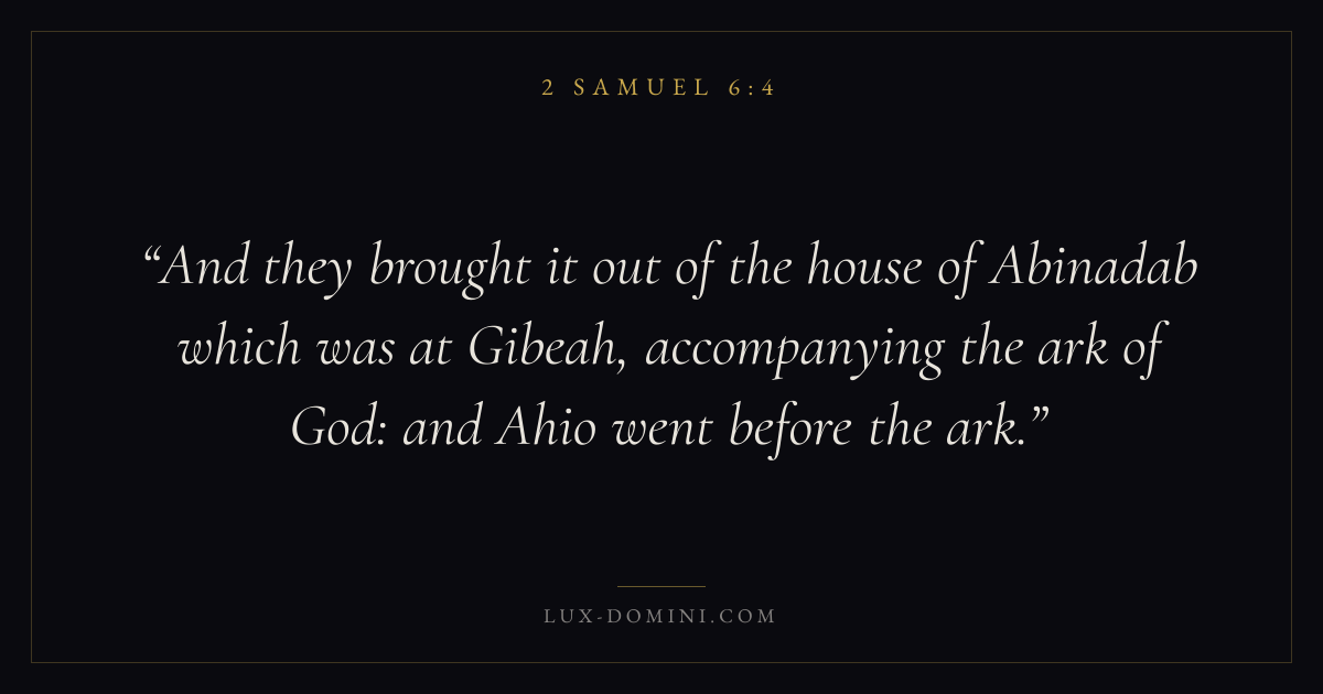 And they brought it out of the house of Abinadab which was at Gibeah, accompanying the ark of God: and Ahio went before the ark.