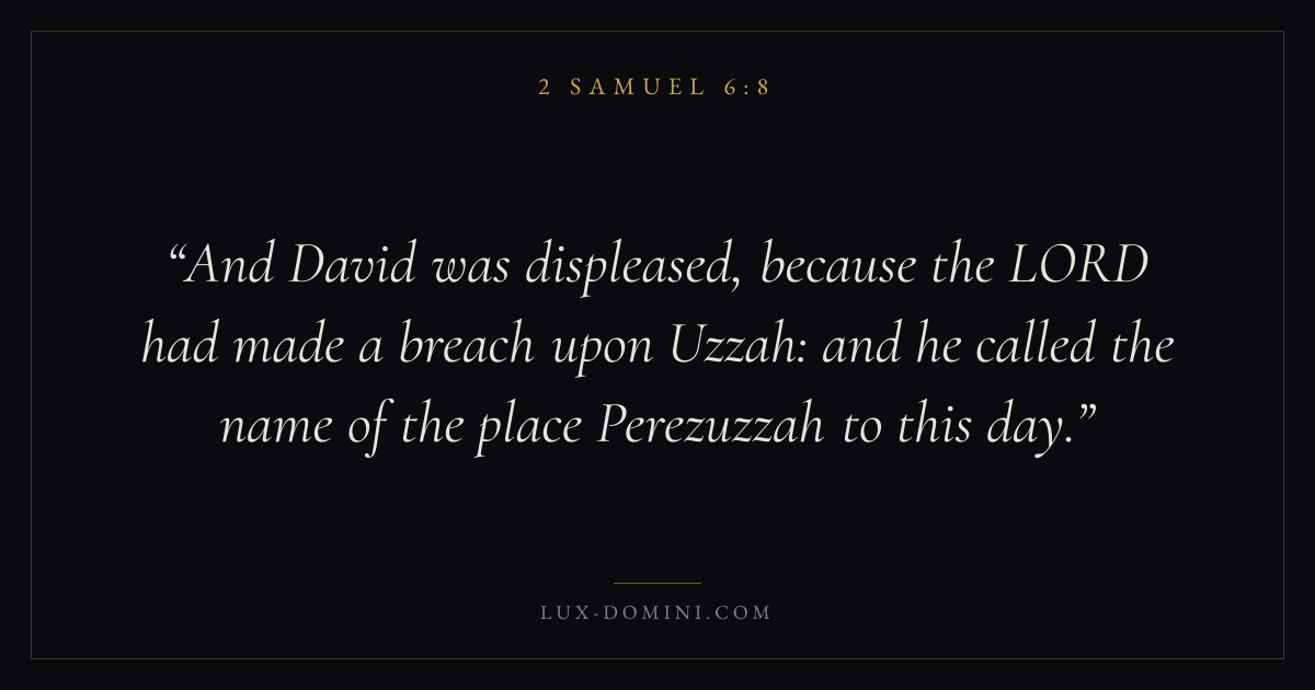 And David was displeased, because the LORD had made a breach upon Uzzah: and he called the name of the place Perezuzzah to this day.