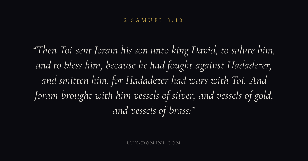 Then Toi sent Joram his son unto king David, to salute him, and to bless him, because he had fought against Hadadezer, and smitten him: for Hadadezer had wars with Toi. And Joram brought with him vessels of silver, and vessels of gold, and vessels of brass: