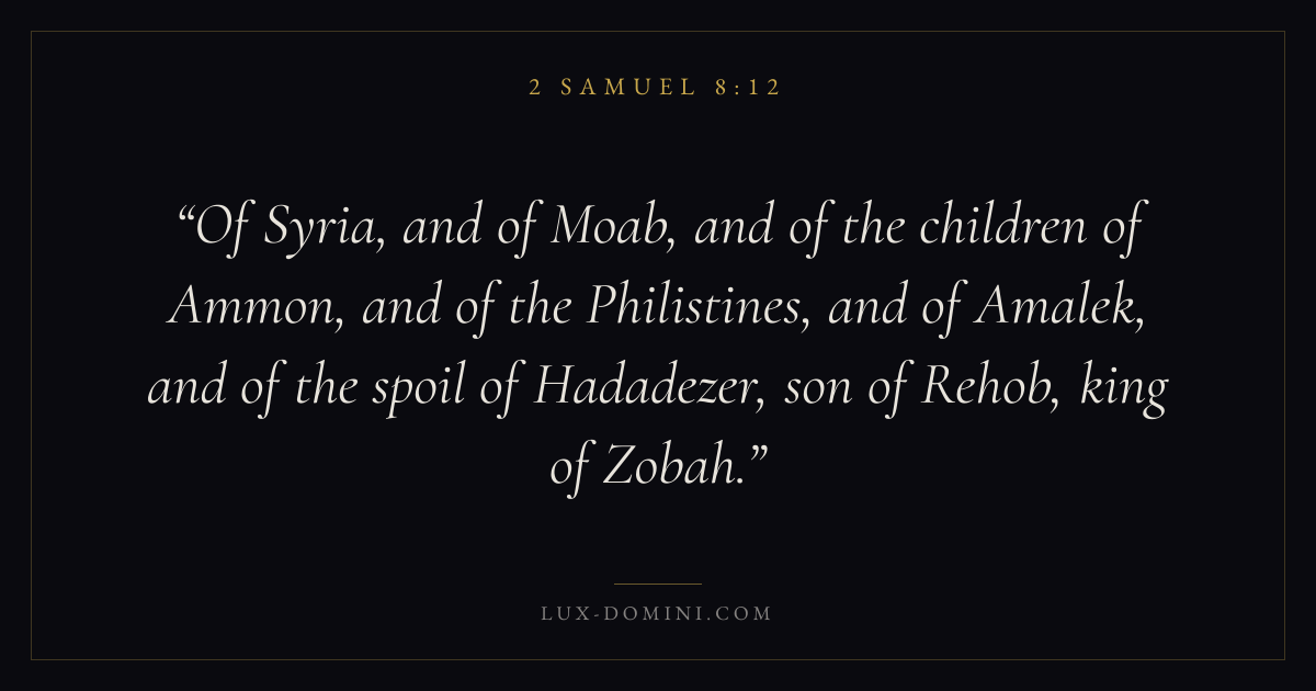 Of Syria, and of Moab, and of the children of Ammon, and of the Philistines, and of Amalek, and of the spoil of Hadadezer, son of Rehob, king of Zobah.