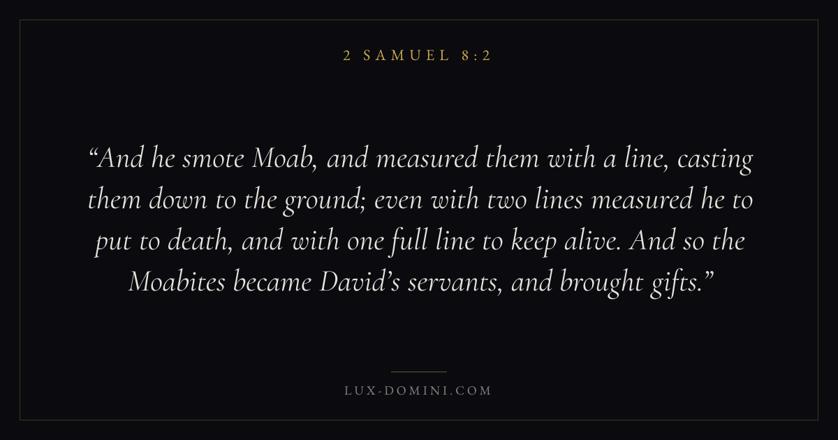 And he smote Moab, and measured them with a line, casting them down to the ground; even with two lines measured he to put to death, and with one full line to keep alive. And so the Moabites became David’s servants, and brought gifts.