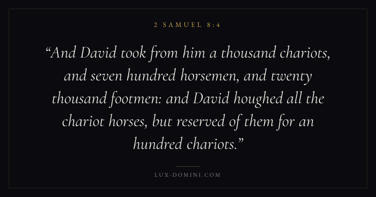 And David took from him a thousand chariots, and seven hundred horsemen, and twenty thousand footmen: and David houghed all the chariot horses, but reserved of them for an hundred chariots.
