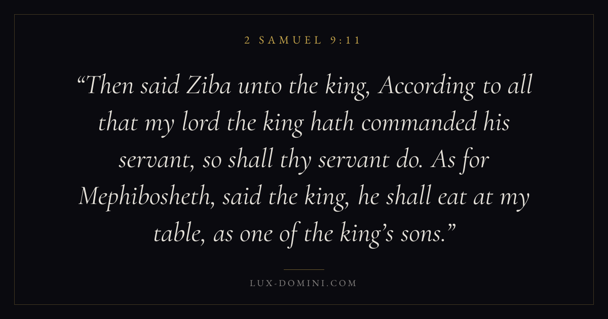 Then said Ziba unto the king, According to all that my lord the king hath commanded his servant, so shall thy servant do. As for Mephibosheth, said the king, he shall eat at my table, as one of the king’s sons.