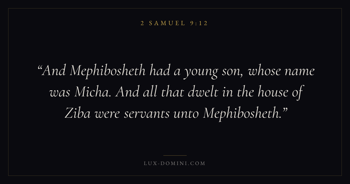 And Mephibosheth had a young son, whose name was Micha. And all that dwelt in the house of Ziba were servants unto Mephibosheth.