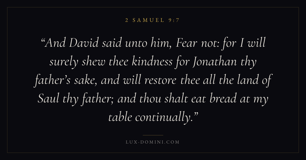 And David said unto him, Fear not: for I will surely shew thee kindness for Jonathan thy father’s sake, and will restore thee all the land of Saul thy father; and thou shalt eat bread at my table continually.