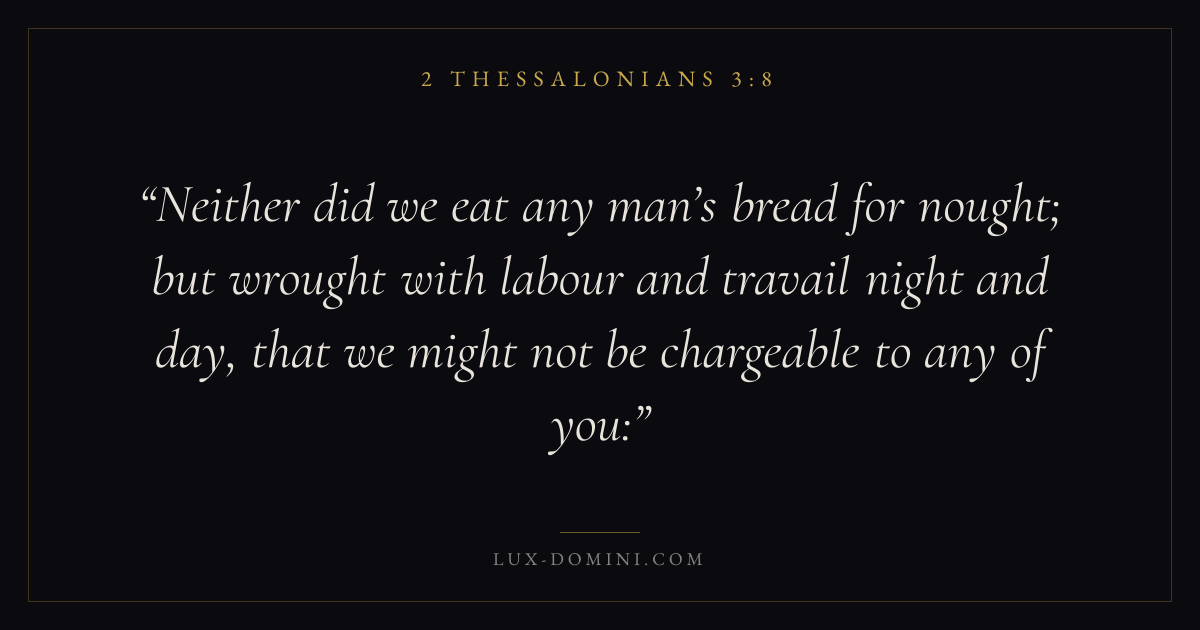 Neither did we eat any man’s bread for nought; but wrought with labour and travail night and day, that we might not be chargeable to any of you: