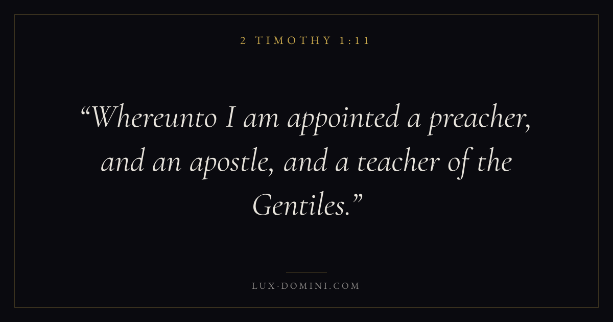 Books / 2 Timothy / Chapter 1 / Verse 11 ← 2 Timothy 1:10 2 Timothy 1:11 2 Timothy 1:12 → Whereunto I am appointed a preacher, and an apostle, and a teacher of the Gentiles. Download verse card Share on Twitter Share on Facebook Pin it ✦ Key themes LoveAnxiety and fearSuffering and trialsPeaceEndurance Read with 2 Timothy 1:82 Timothy 1:9John 3:161 Corinthians 13:4 Related topics Bible verses about loveBible verses about anxiety and fearBible verses about suffering and trialsBible verses about peace ✦ 2 Timothy Chapter 1 verses V. 1 V. 2 V. 3 V. 4 V. 5 V. 6 V. 7 V. 8 V. 9 V. 10 V. 11 V. 12 V. 13 V. 14 V. 15 V. 16 V. 17 V. 18