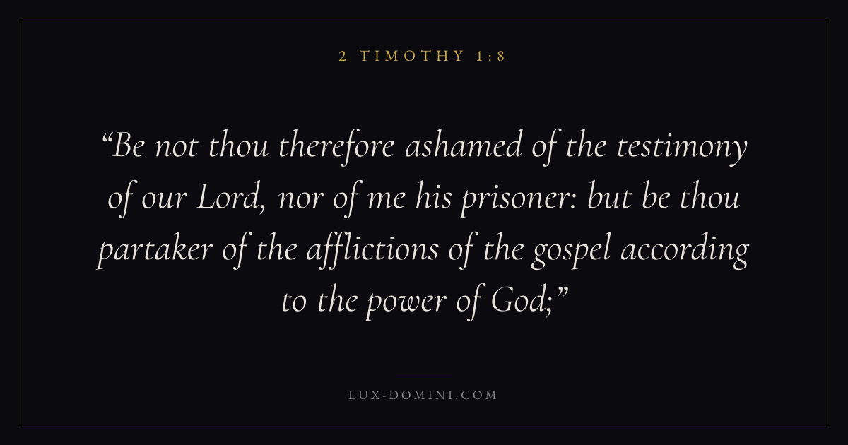 Be not thou therefore ashamed of the testimony of our Lord, nor of me his prisoner: but be thou partaker of the afflictions of the gospel according to the power of God;