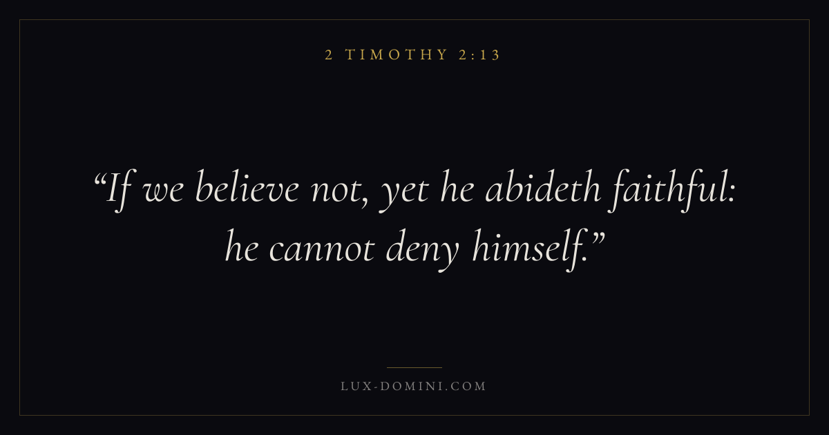 Books / 2 Timothy / Chapter 2 / Verse 13 ← 2 Timothy 2:12 2 Timothy 2:13 2 Timothy 2:14 → If we believe not, yet he abideth faithful: he cannot deny himself. Download verse card Share on Twitter Share on Facebook Pin it ✦ Key themes FaithSuffering and trialsEnduranceScripture Read with 2 Timothy 2:112 Timothy 2:12Hebrews 11:1Romans 10:17 Related topics Bible verses about faithBible verses about suffering and trials ✦ 2 Timothy Chapter 2 verses V. 1 V. 2 V. 3 V. 4 V. 5 V. 6 V. 7 V. 8 V. 9 V. 10 V. 11 V. 12 V. 13 V. 14 V. 15 V. 16 V. 17 V. 18 V. 19 V. 20 V. 21 V. 22 V. 23 V. 24 V. 25 V. 26