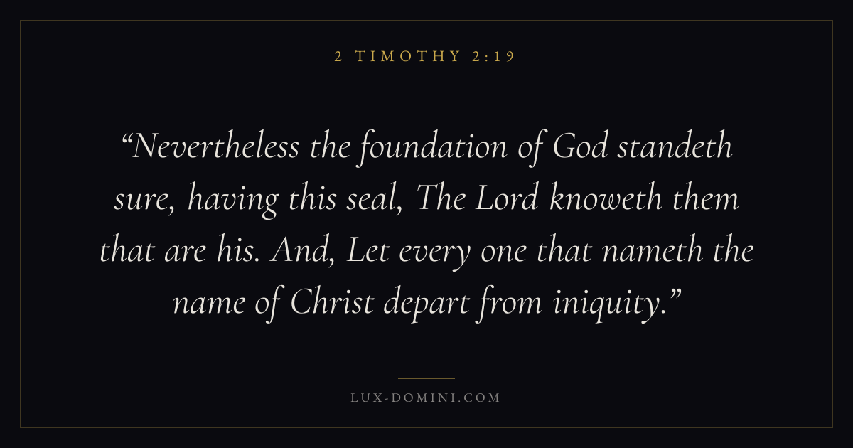 Nevertheless the foundation of God standeth sure, having this seal, The Lord knoweth them that are his. And, Let every one that nameth the name of Christ depart from iniquity.