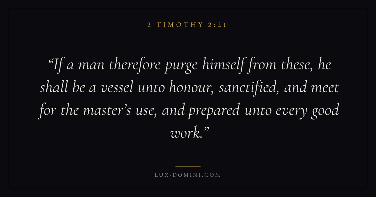 If a man therefore purge himself from these, he shall be a vessel unto honour, sanctified, and meet for the master’s use, and prepared unto every good work.