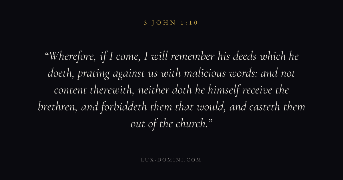 Wherefore, if I come, I will remember his deeds which he doeth, prating against us with malicious words: and not content therewith, neither doth he himself receive the brethren, and forbiddeth them that would, and casteth them out of the church.