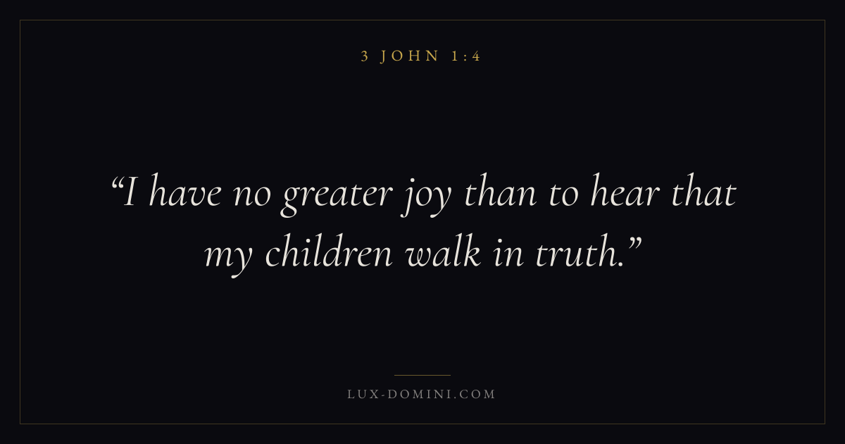 Books / 3 John / Chapter 1 / Verse 4 ← 3 John 1:3 3 John 1:4 3 John 1:5 → I have no greater joy than to hear that my children walk in truth. Download verse card Share on Twitter Share on Facebook Pin it ✦ Key themes LoveTruthHospitalityLeadership Read with 3 John 1:23 John 1:3John 3:161 Corinthians 13:4 Related topics Bible verses for a new babyBible verses for fathersBible verses about loveBible verses about truthBible verses about leadership ✦ 3 John Chapter 1 verses V. 1 V. 2 V. 3 V. 4 V. 5 V. 6 V. 7 V. 8 V. 9 V. 10 V. 11 V. 12 V. 13 V. 14